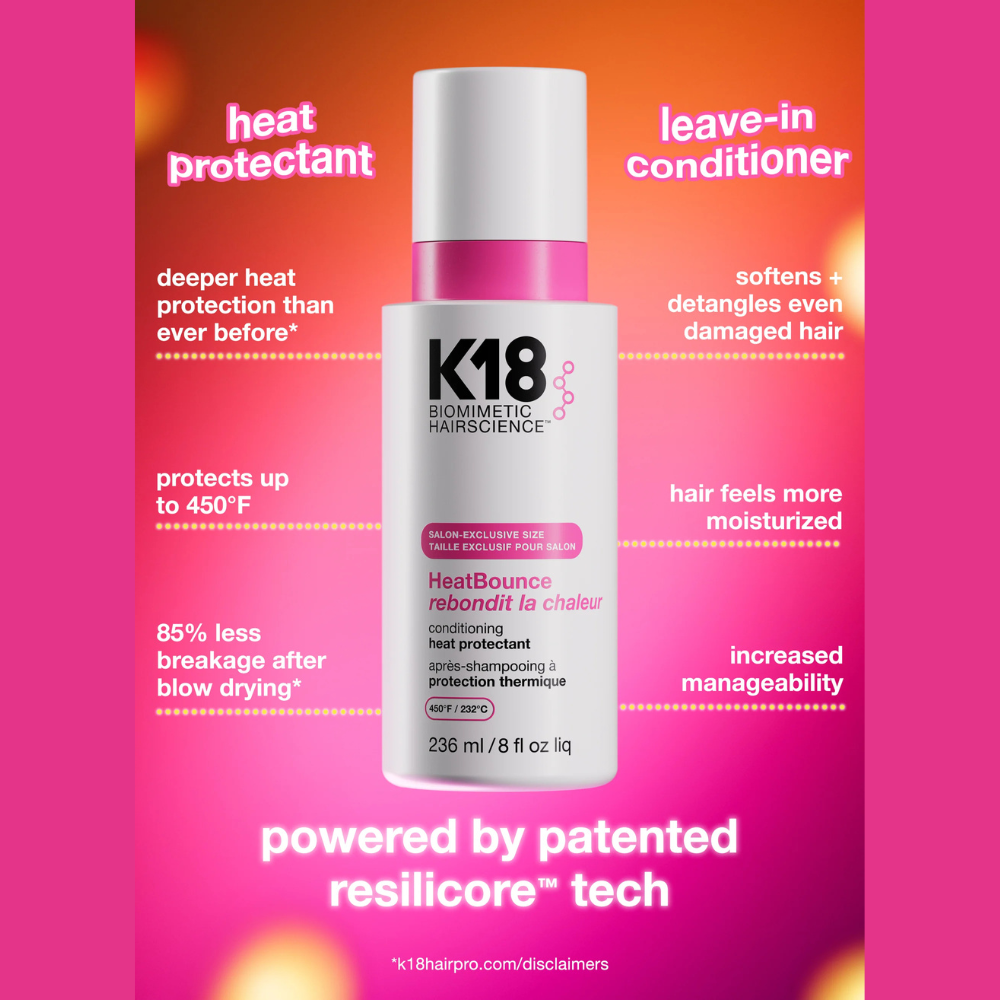 K18 HeatBounce features revolutionary ResiliCore™ heat-shielding technology that's inspired by proteins in nature that can withstand extreme temperatures. Unlike ordinary heat protectants, this advanced formula delivers deeper heat protection than ever before, reducing breakage by an impressive 85% after blow drying.